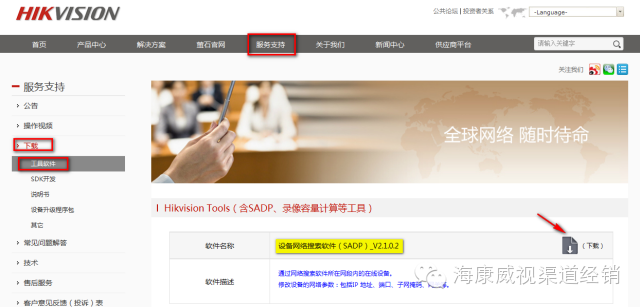 b,电脑软件:SADP,即设备网络搜索软件。下载地址:海康官网-【服务支持】-【下载】-【工具软件】-【Hikvision Tools(含SADP、录像容量计算等工具)】。